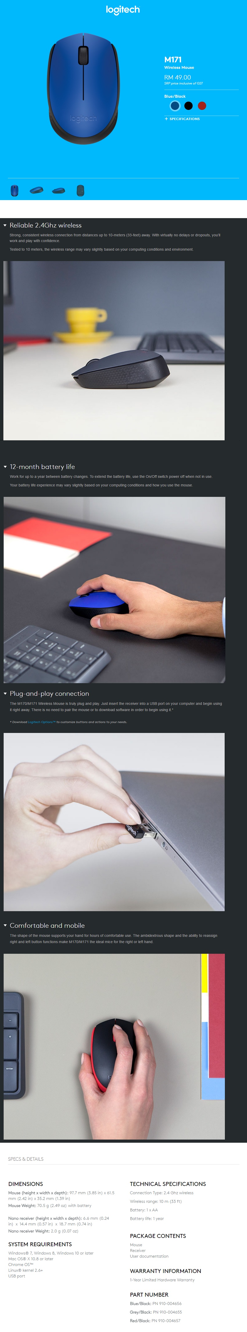 • The M171 Wireless Mouse is truly plug and play. Just insert the receiver into a USB port on your computer and begin using it right away. There is no need to pair the mouse or to download software in order to begin using it.*