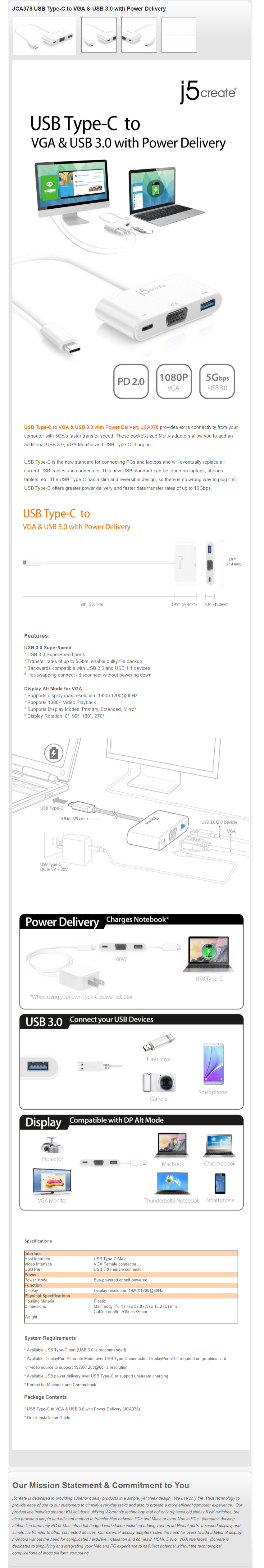 1 X J5 JCA378 USB Type-C to VGA/USB 3.0 Hub/PD 2.0