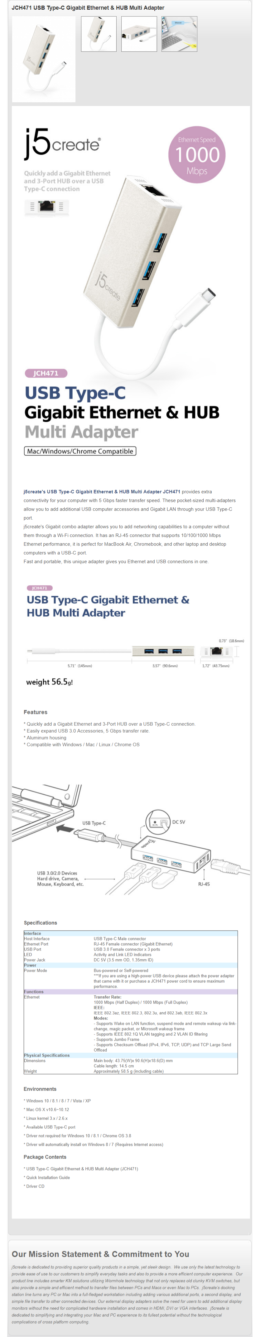 1 x J5 JCH471 Type-C Gigabit Ethernet & USB 3.0 HUB Multi-Adapter