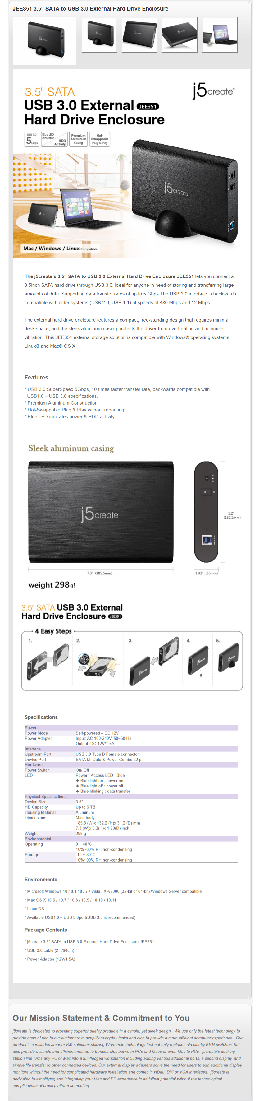 1 X J5 JEE351-10 3.5" SATA to USB 3.0 External Hard Drive Enclosure