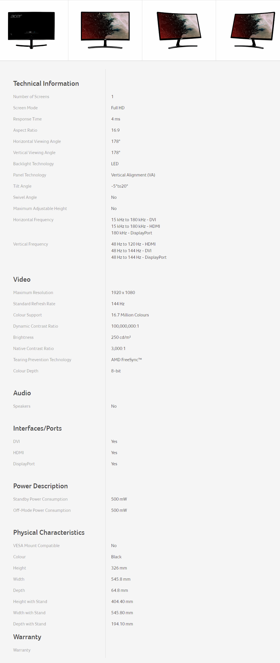 1x Acer 25" ED242QR Gaming Curved Monitor