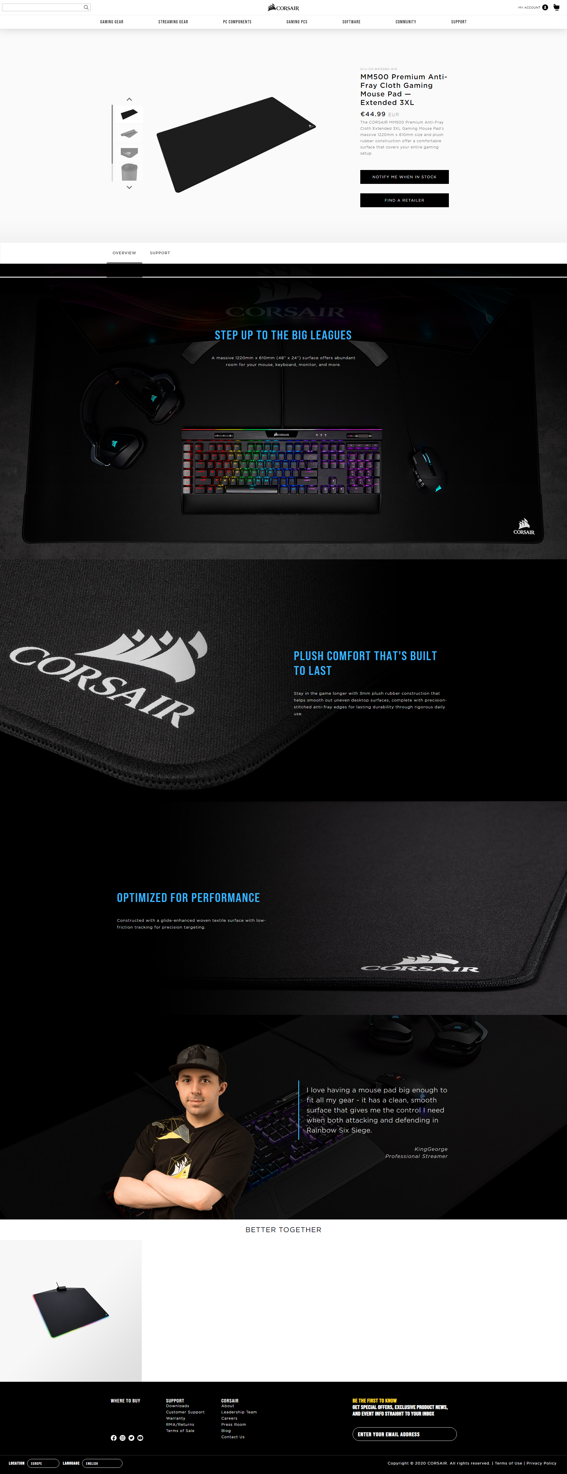 1x CORSAIR MM500 Premium Anti-Fray Cloth Gaming Mouse Pad — Extended 3XL
