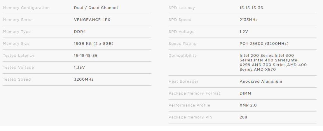 1x Vengeance LPX (K2) - 3600MHz/ 3200MHz/ 2666MHz