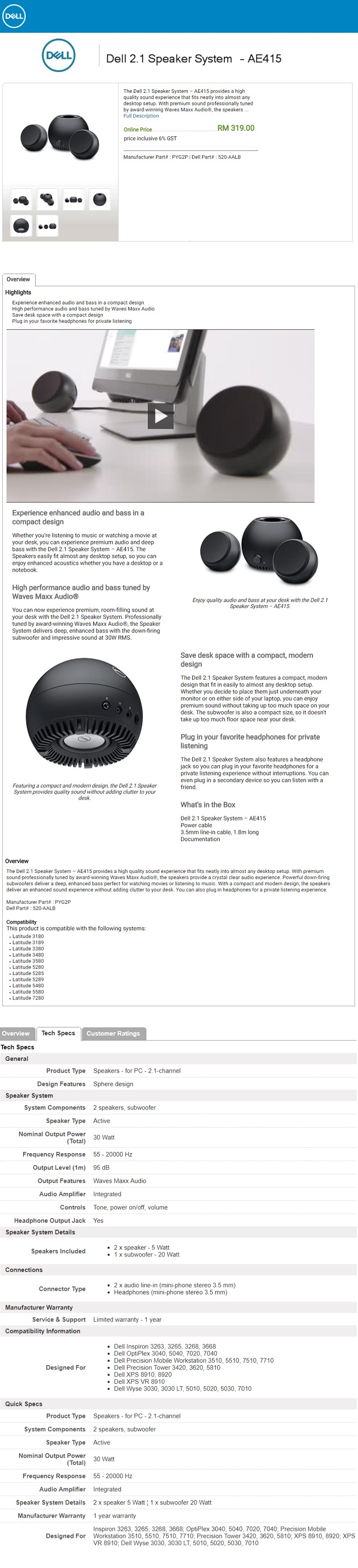 - Dell 2.1 Speaker System – AE415
