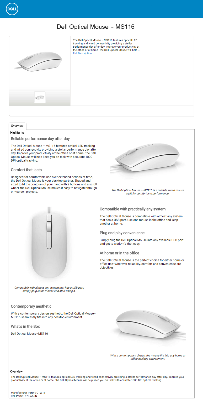 1x Dell MS116 Optical USB Mouse