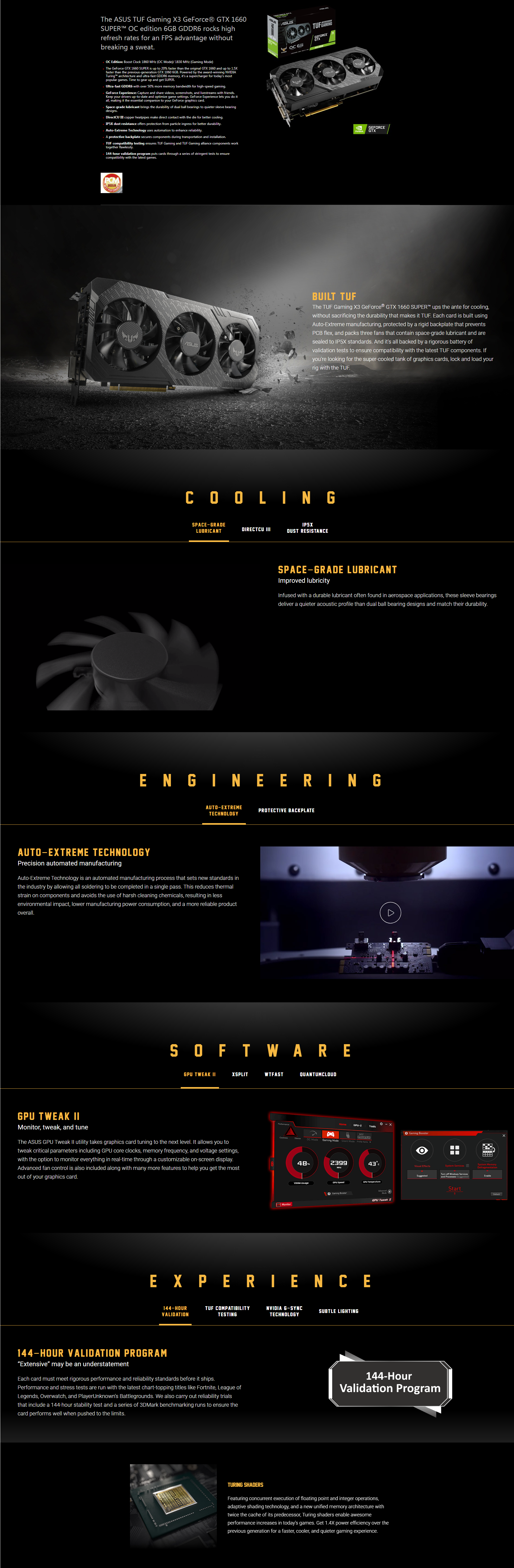• Tuf compatibility testing runs cards through a suite of tests to ensure TUF Gaming motherboards, chassis, and other TUF Gaming Alliance components work together flawlessly