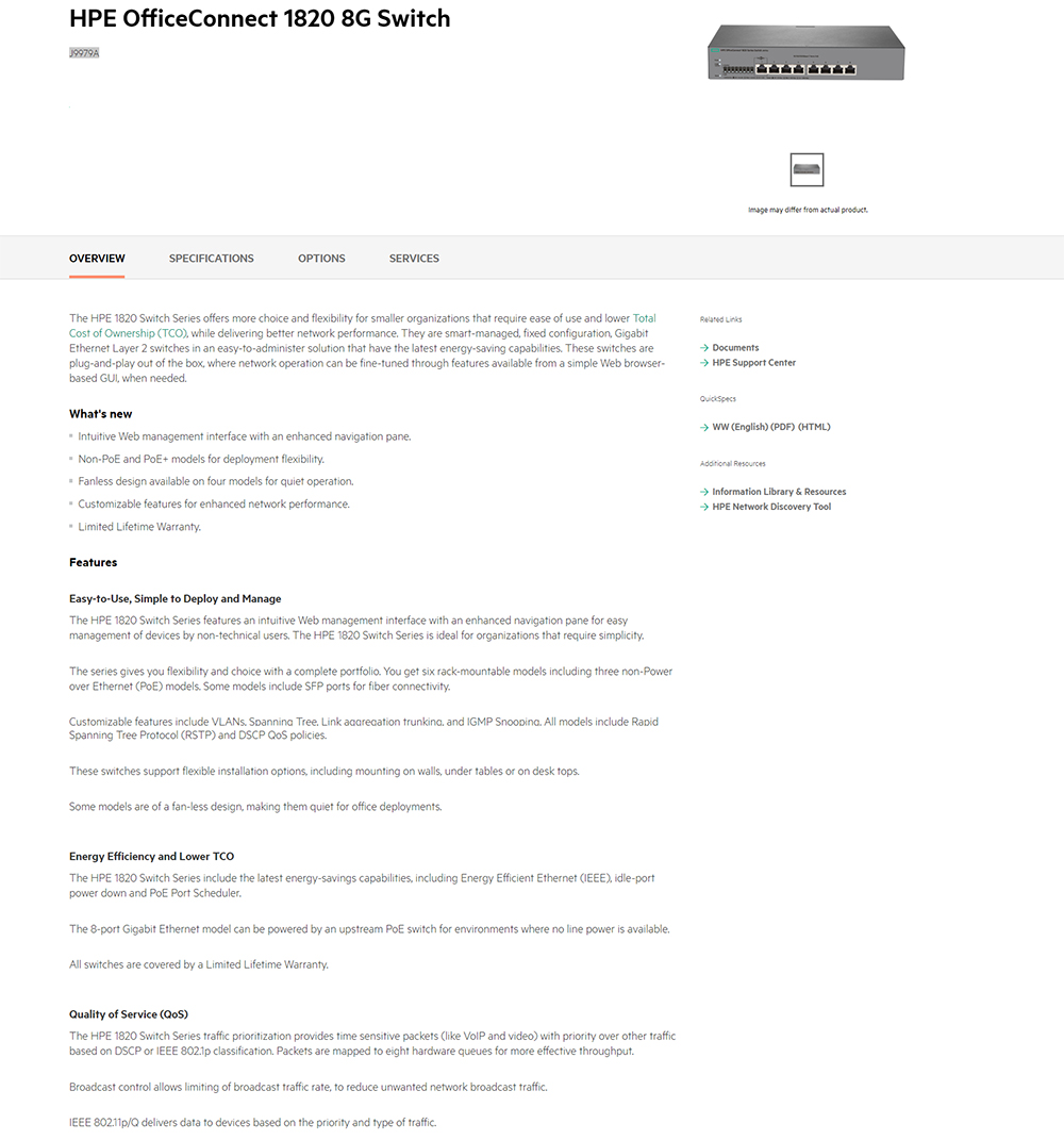 1x Hewlett Packard Enterprise OfficeConnect 1820 8G Switch
