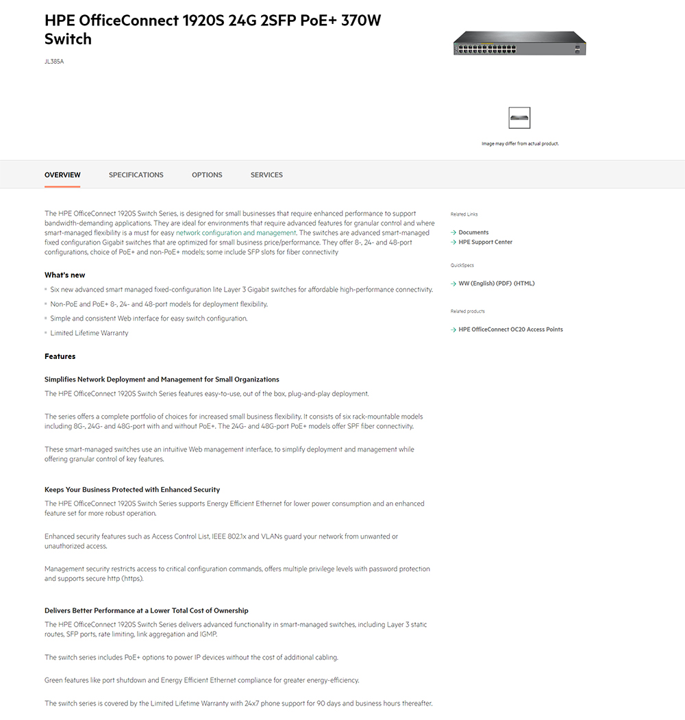 Hewlett Packard Enterprise OfficeConnect 1920S 24G 2SFP PoE+ 370W Switch