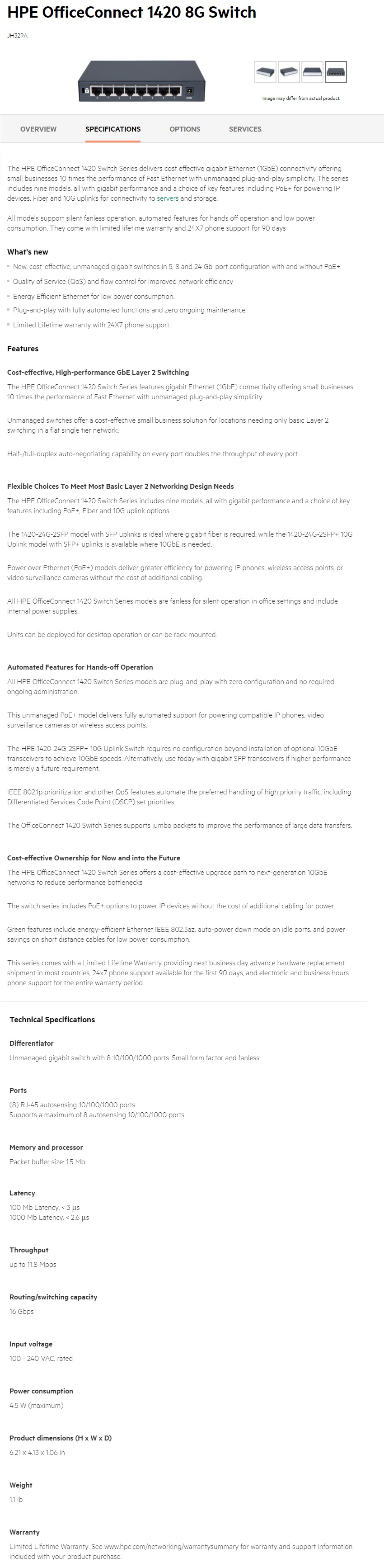 1X Hewlett Packard Enterprise JH329A OfficeConnect 1420 8G Switch