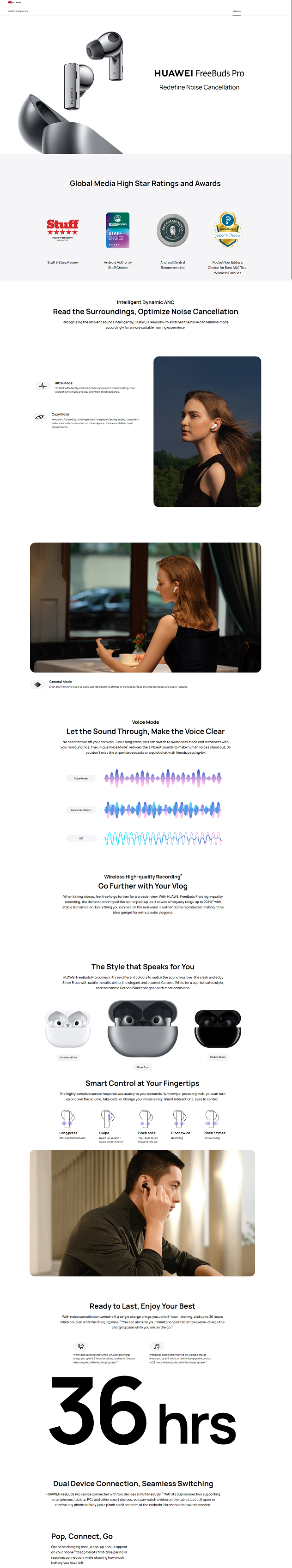 - Optimize Noise Cancellation: HUAWEI FreeBuds Pro recognizes the ambient sounds intelligently, which switches the noise cancellation mode accordingly for a more suitable hearing experience