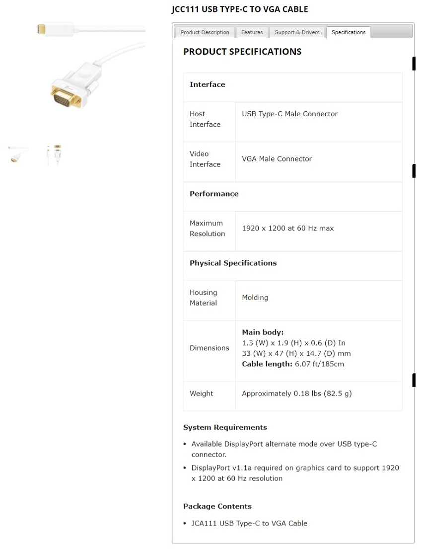 J5 JCC111 USB Type-C to VGA Cable 1.8M