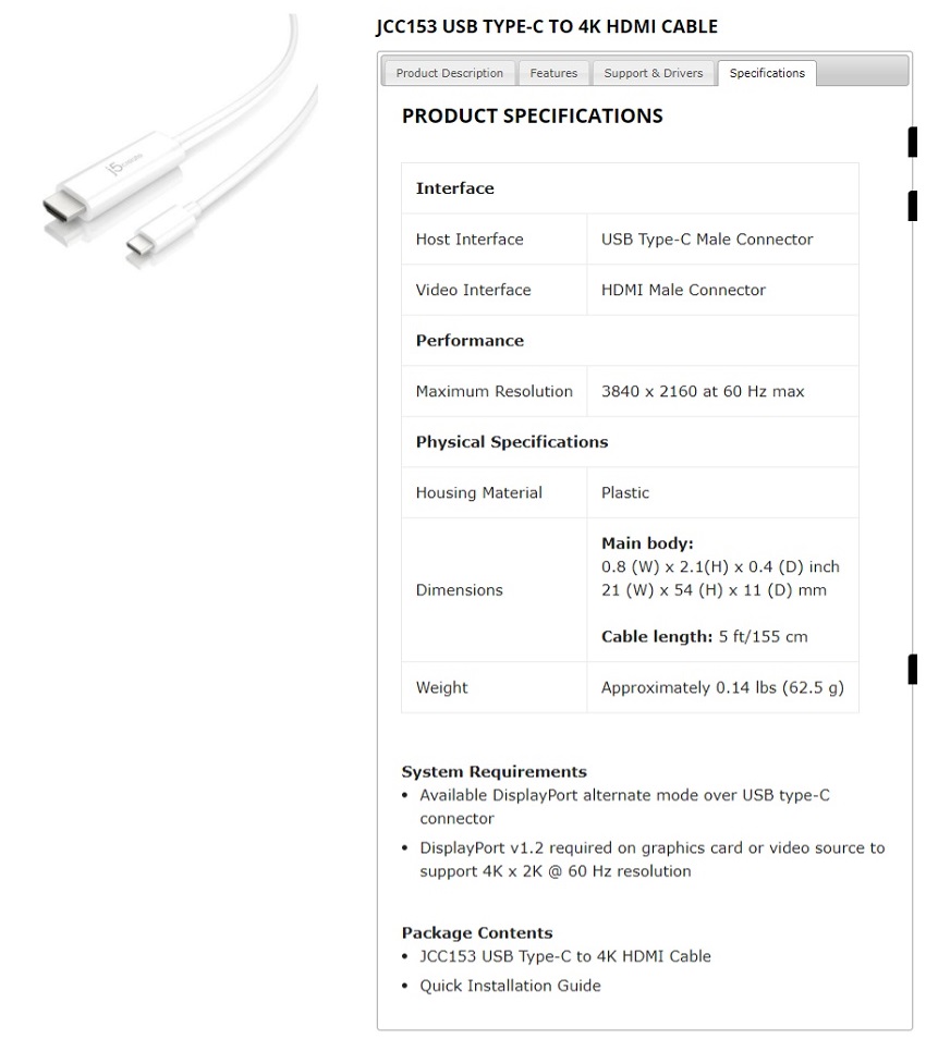 J5 JCC153 Type-C to 4K HDMI Cable 1.5M x1