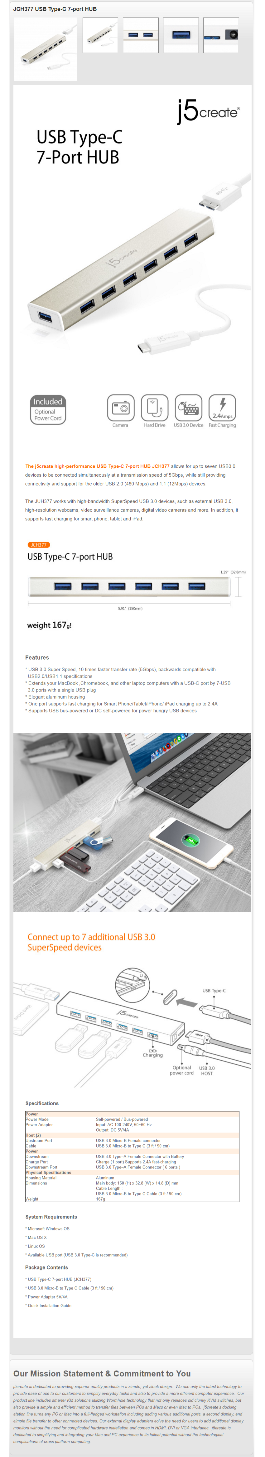 1 x J5 JCH377 USB Type-C 7-Port USB 3.0 Hub with AC Adapter