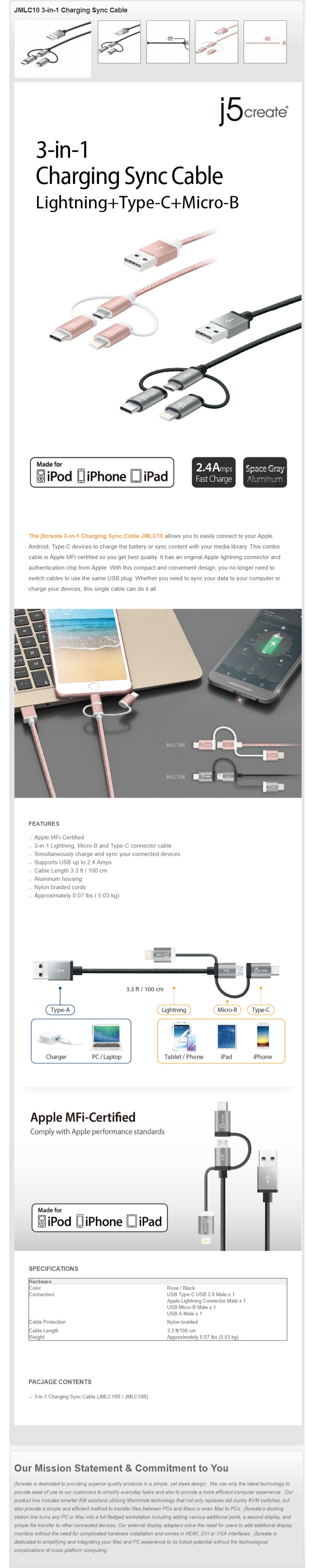1 x J5 JCML10B Micro-USB Cable with Lightning & Type-C Adapter (3-in-1)