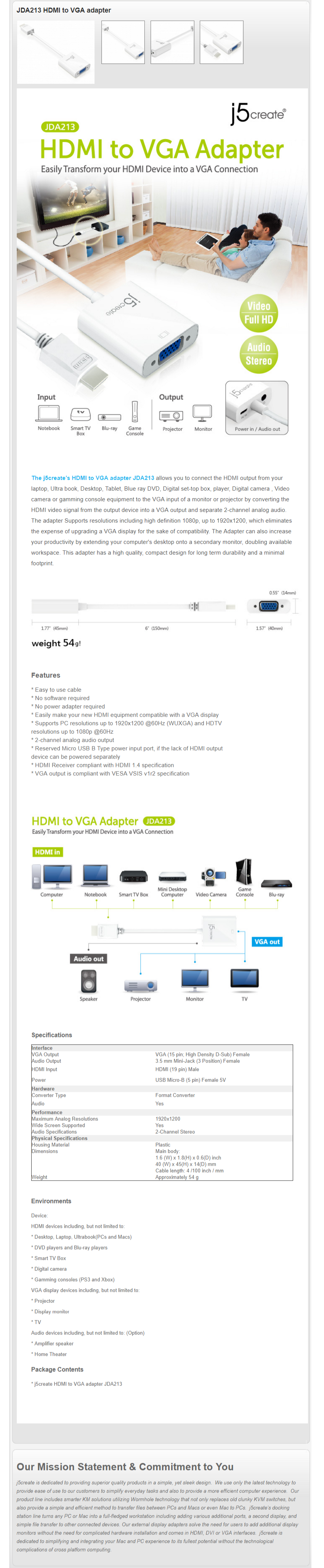 1 X J5 JDA213 HDMI to VGA Adapter