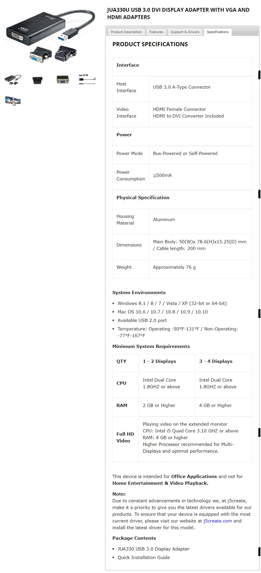 J5 JUA330U USB 3.0 DVI Display Adapter With VGA & HDMI Adapter x1