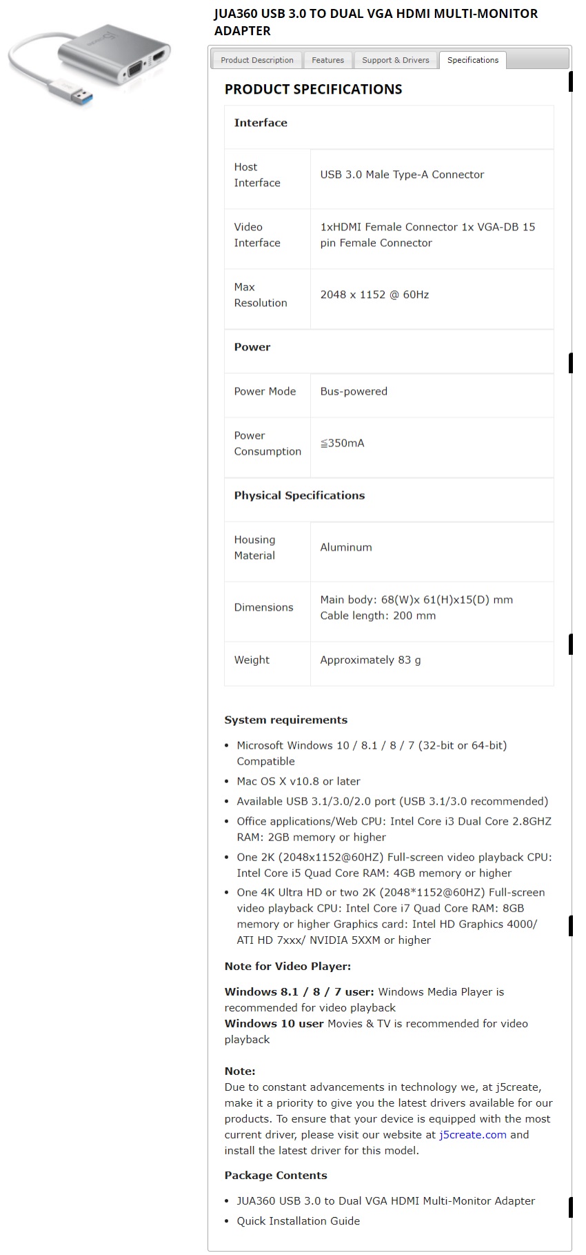 J5 JUA360 USB 3.0 to Dual VGA HDMI Multi-Monitor Adapeter x1