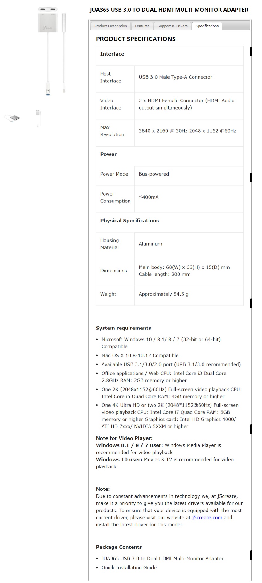 J5 JUA365 USB 3.0 to Dual HDMI Multi-Monitor Adapter x1