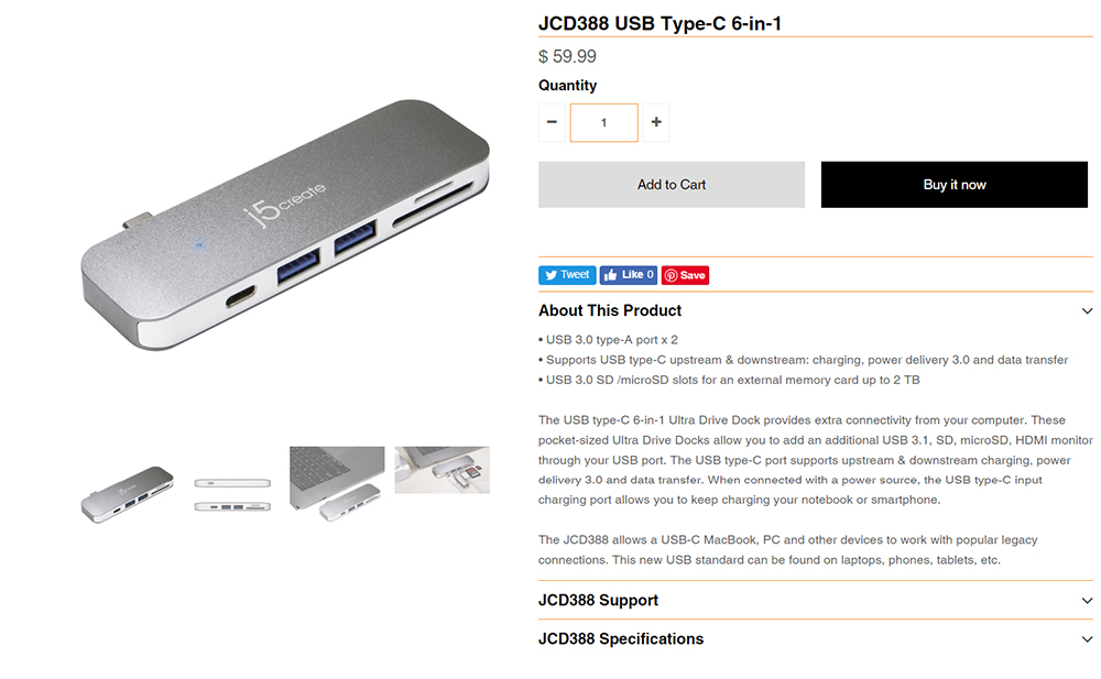 1x J5 CREATE JCD388 USB Type-C 6-in-1