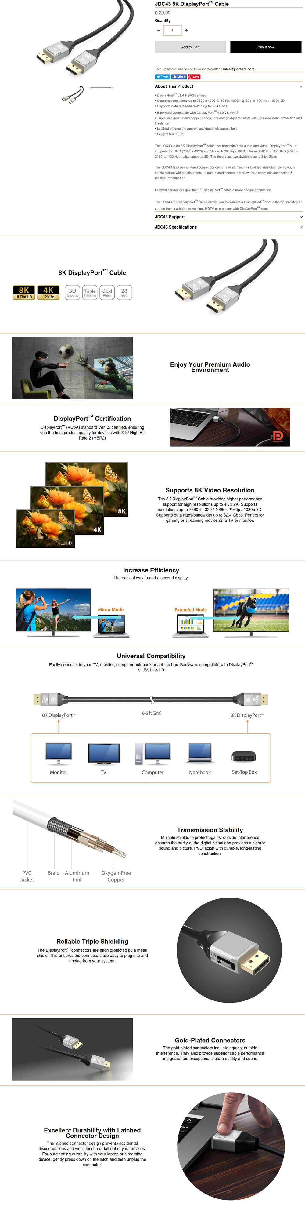 1x J5 CREATE JDC43 8K DisplayPort™ Cable