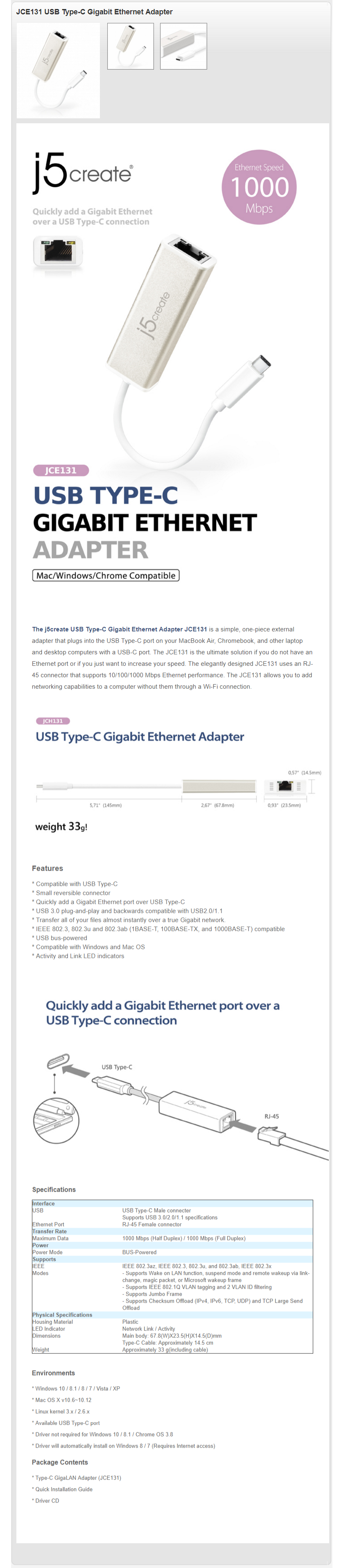 1x J5 JCE131 USB Type-C Gigabit Ethernet Adapter