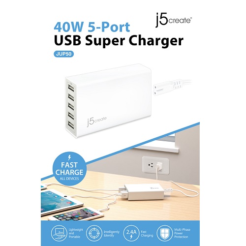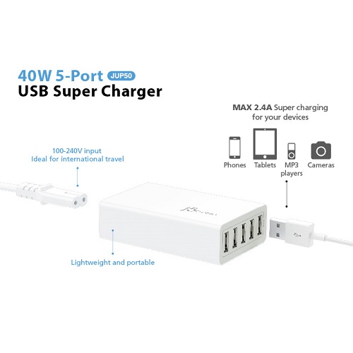 - 5-Port 40 watts/8 amps Super USB Charger allows for faster charging of 5 devices simultaneously