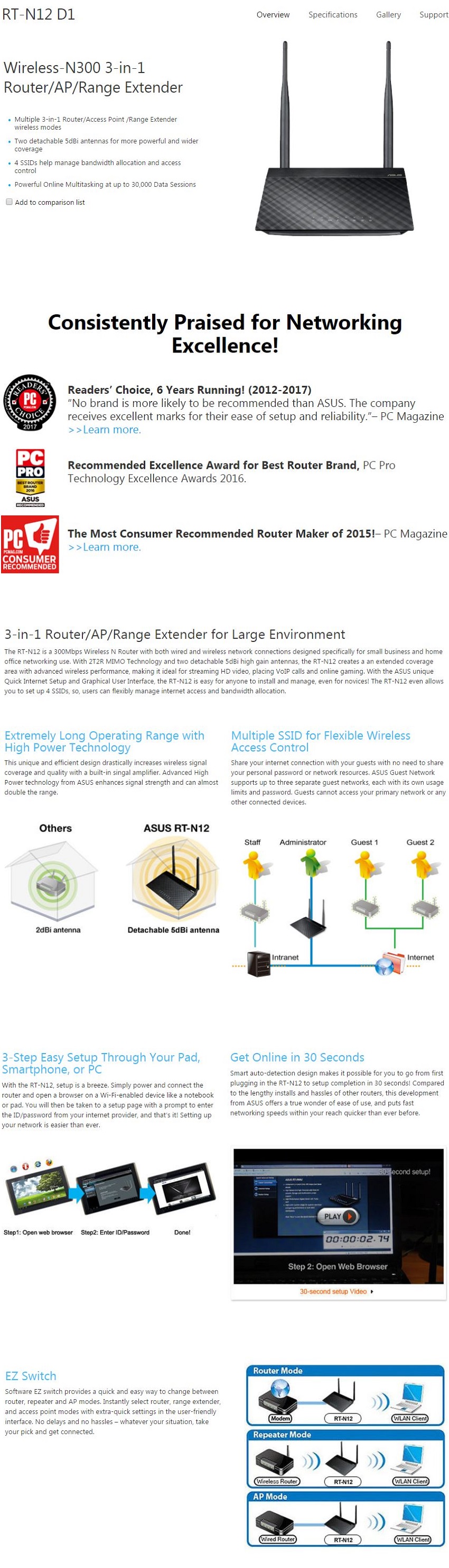 Asus (RT-N12 D1) Wireless-N300 3-in-1 Router/AP/Range Extender