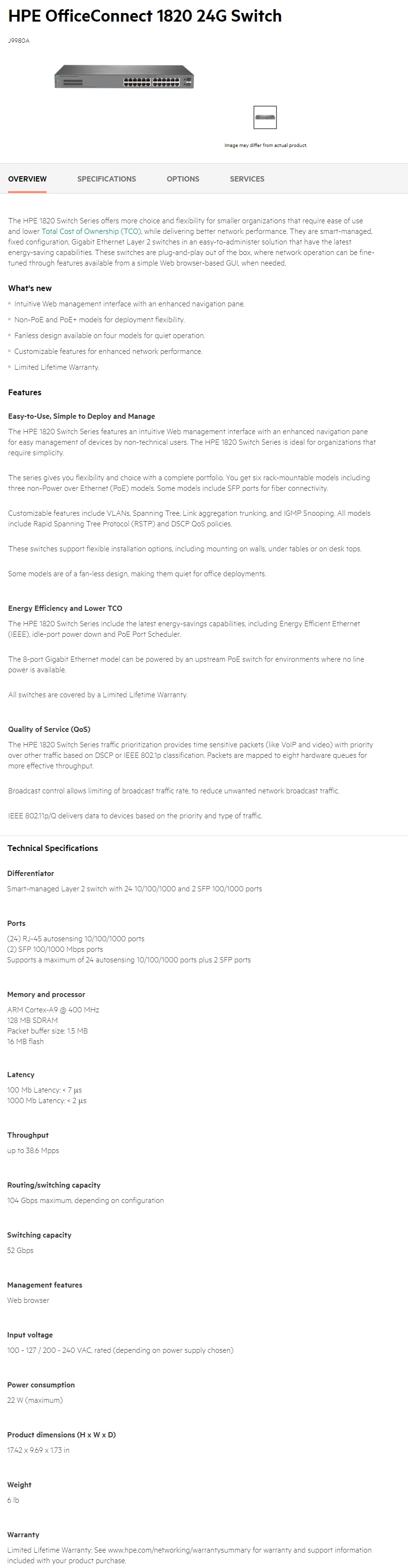1X Hewlett Packard Enterprise J9980A OfficeConnect 1820 24G Switch
