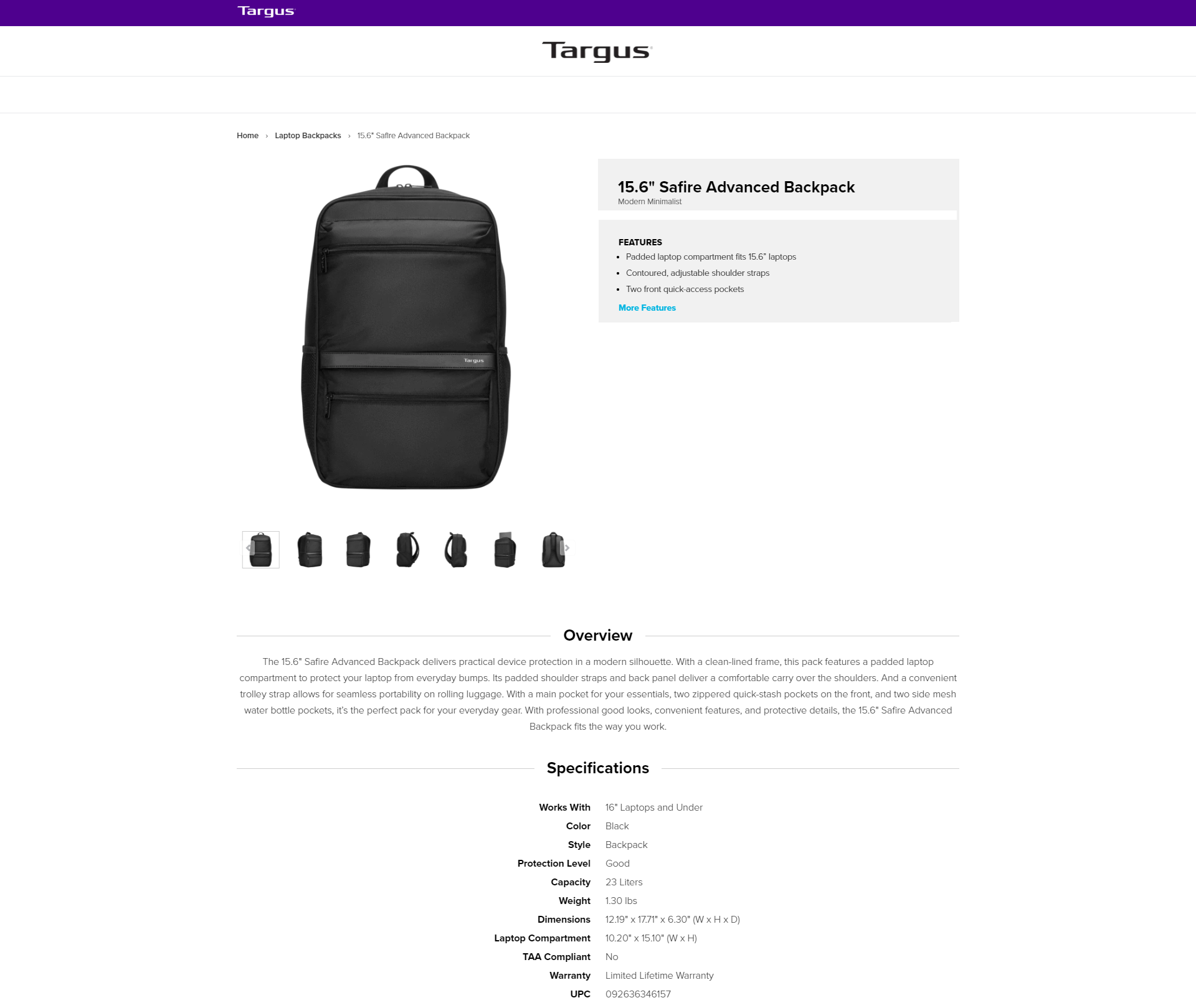 1x Targus Safire Advanced 15.6" Backpack (Black)