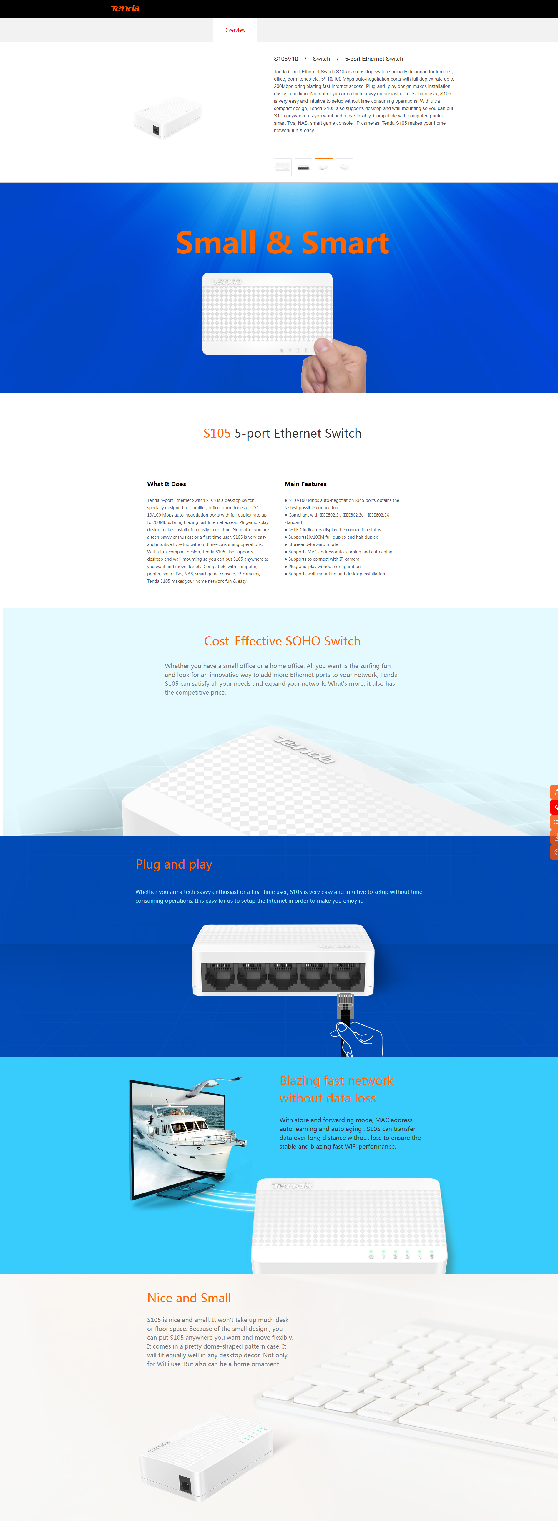 ● 5 10/100M RJ45 ports, Plastic case, DC 5V0.6A