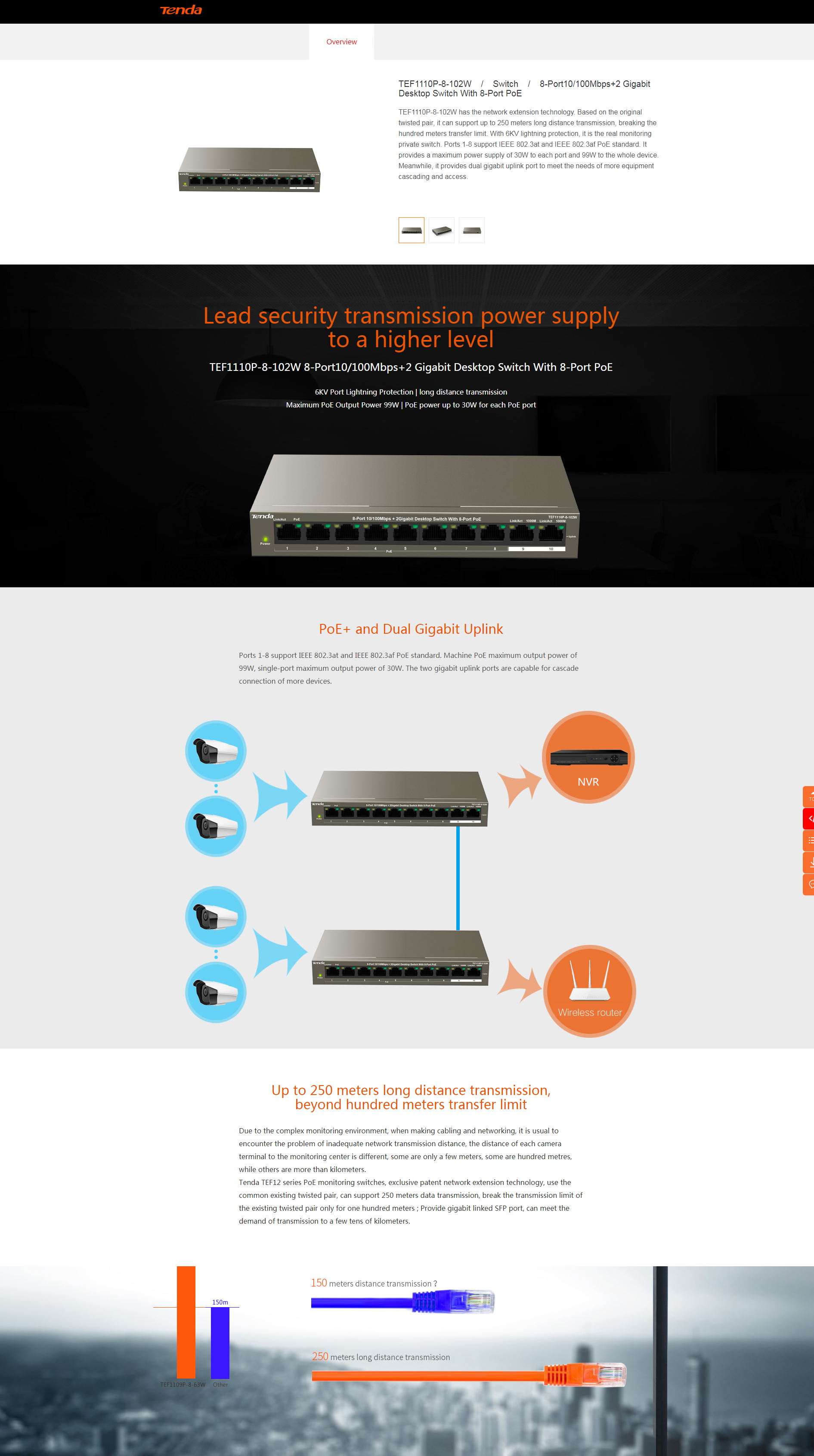 1x Tenda TEF1109P-8-63W 9-Port10/100Mbps Desktop PoE Switch with 8-Port PoE