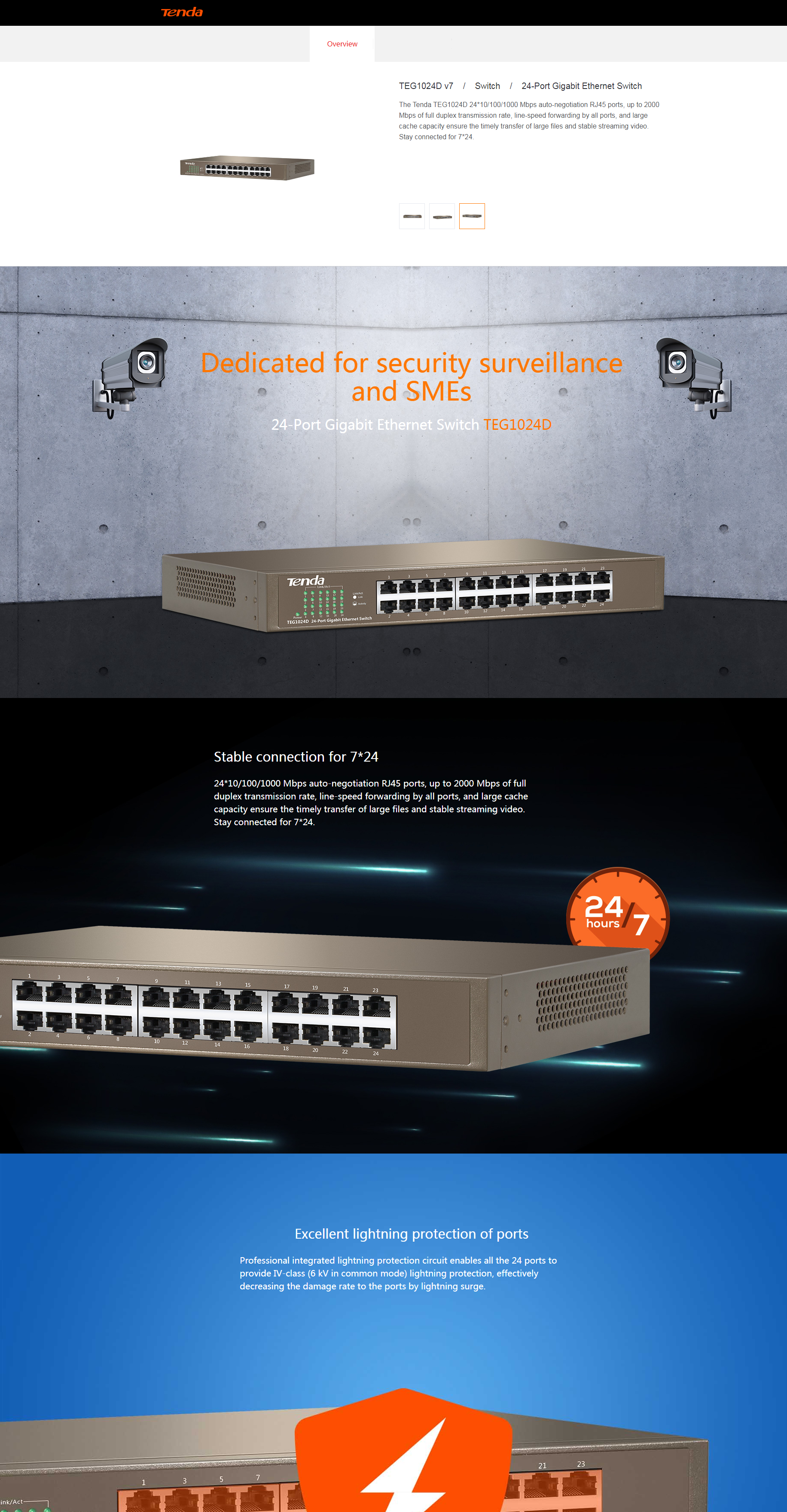 - The Tenda TEG1024D 24*10/100/1000 Mbps auto-negotiation RJ45 ports, up to 2000 Mbps of full duplex transmission rate, line-speed forwarding by all ports, and large cache capacity ensure the timely transfer of large files and stable streaming video. Stay connected for 7*24.