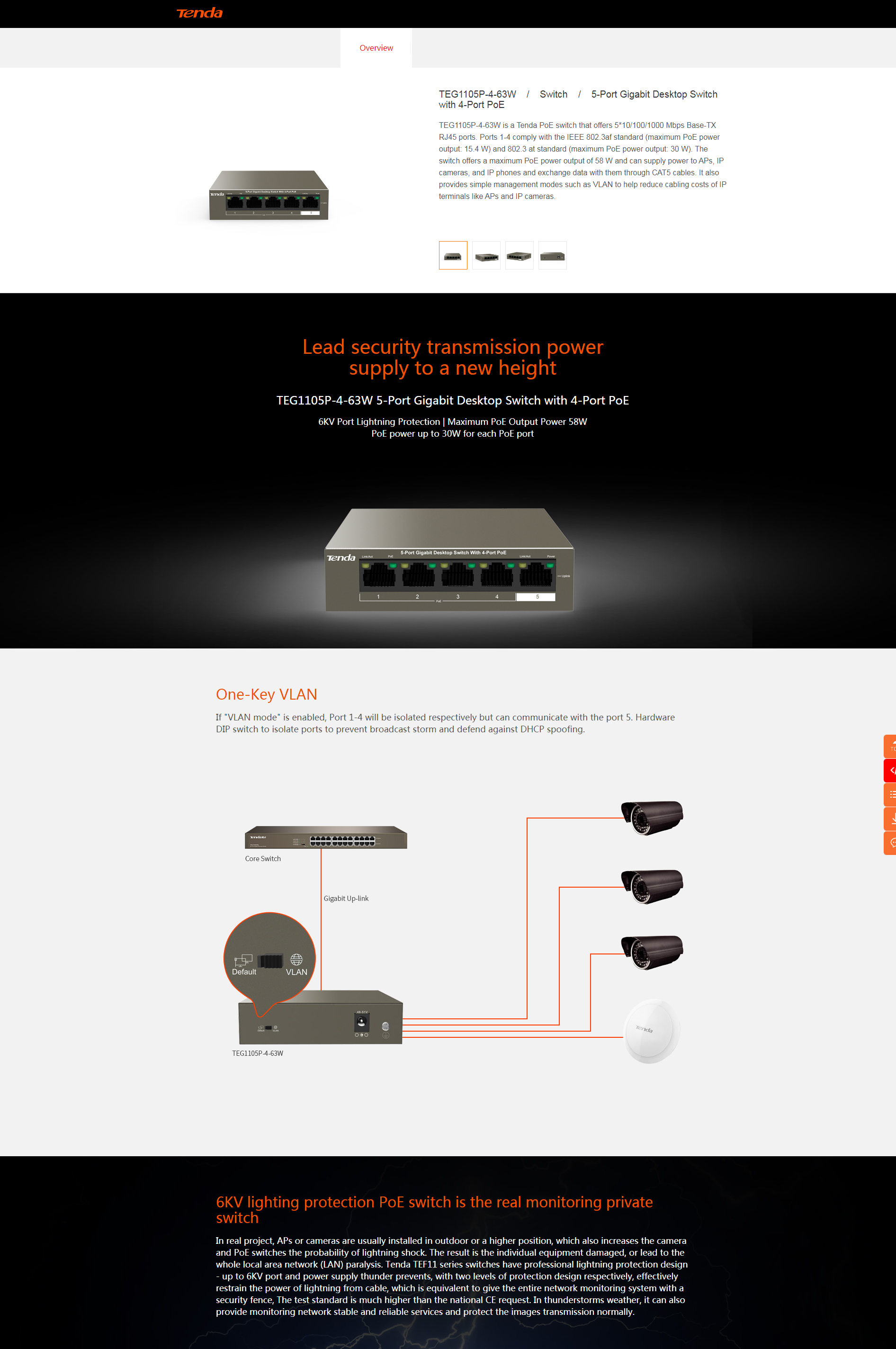 1x Tenda TEG1105P-4-63W 5-Port Gigabit Desktop Switch with 4-Port PoEPort 1 to Port 4