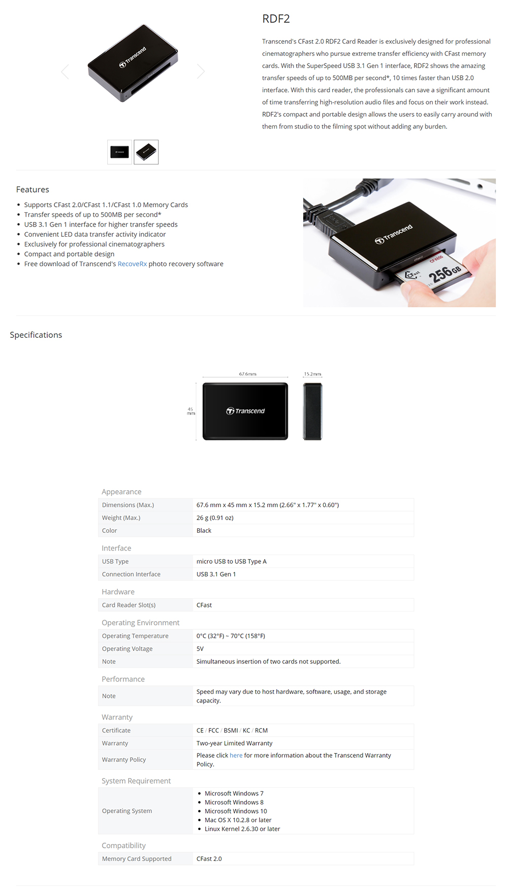 - Supports CFast 2.0/CFast 1.1/CFast 1.0 Memory Cards