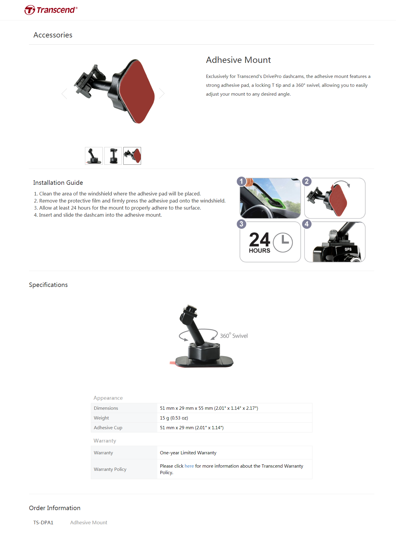 1x TRANSCEND DRIVEPRO CAR Adhesive Mount