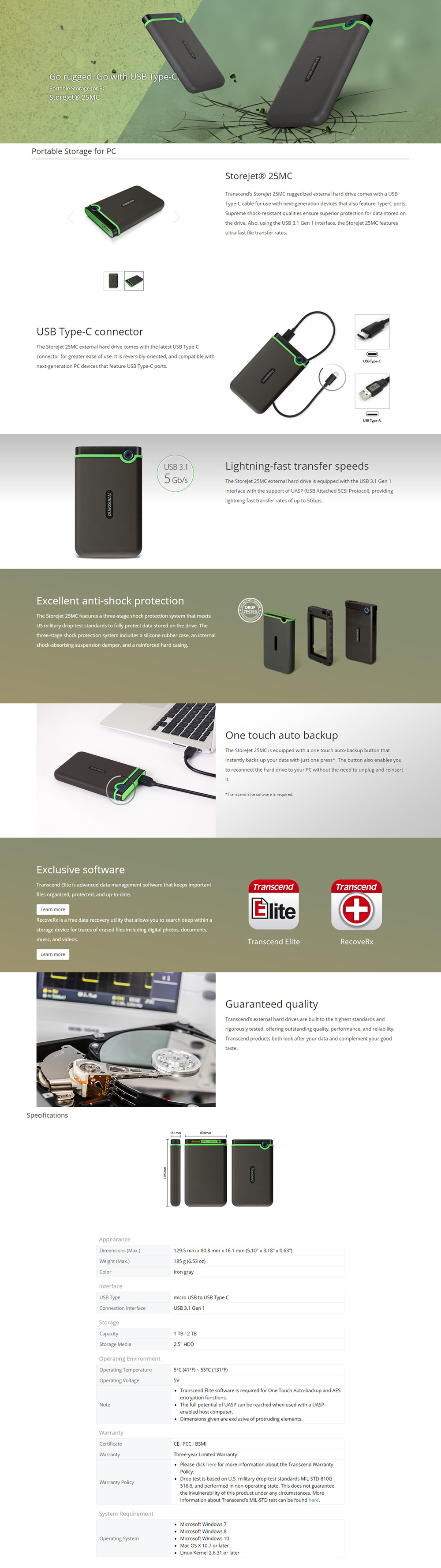 1x Transcend StoreJet® 25MC 2.5" USB Type-C Portable Hard Drive 2TB
