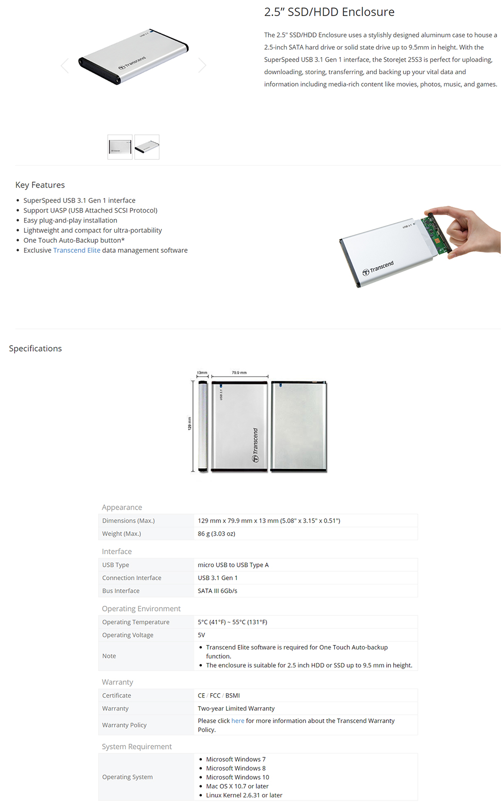 1x Transcend StoreJet 25S3 USB 3.0 / 3.1 Enclosure (SSD)