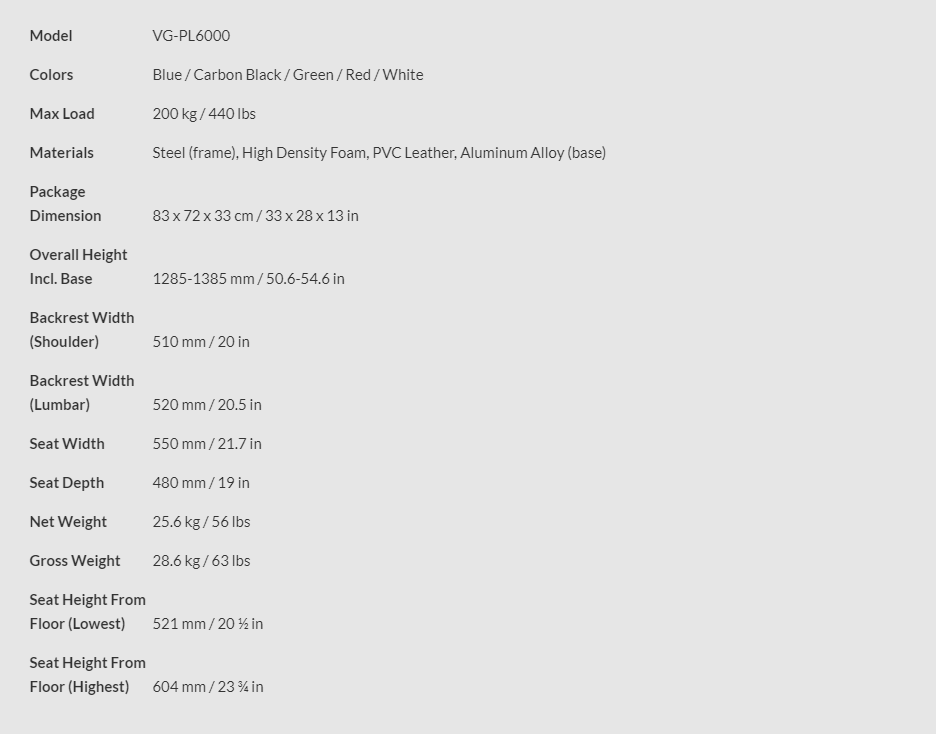 The Vertagear Racing Series P-Line PL6000 gaming chair is designed for comfort and equipped with superior ergonomic features. The industrial strength, extra padded gaming chair provides greater support and durability for your entire frame and head. The Plus Line (PL) is the perfect fit for users desiring more space. Assembled with a wide range of adjustability that enhances gamers' personal comfort, relax for extended periods during your intense gaming sessions. Recommended height: 5'9" - 6'8".
